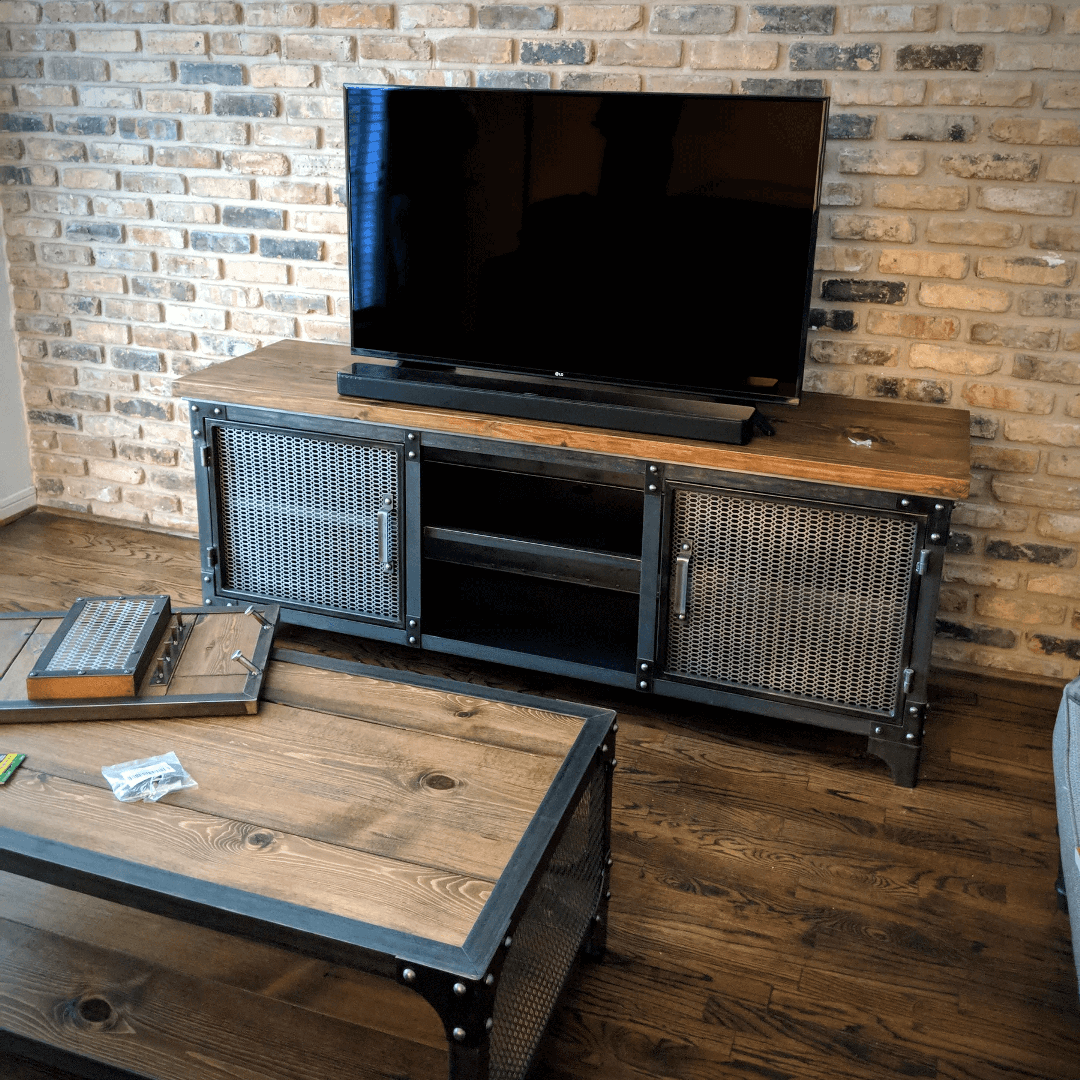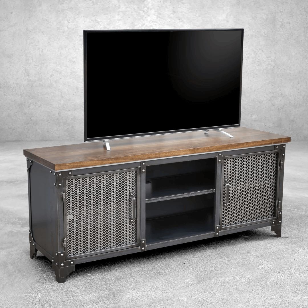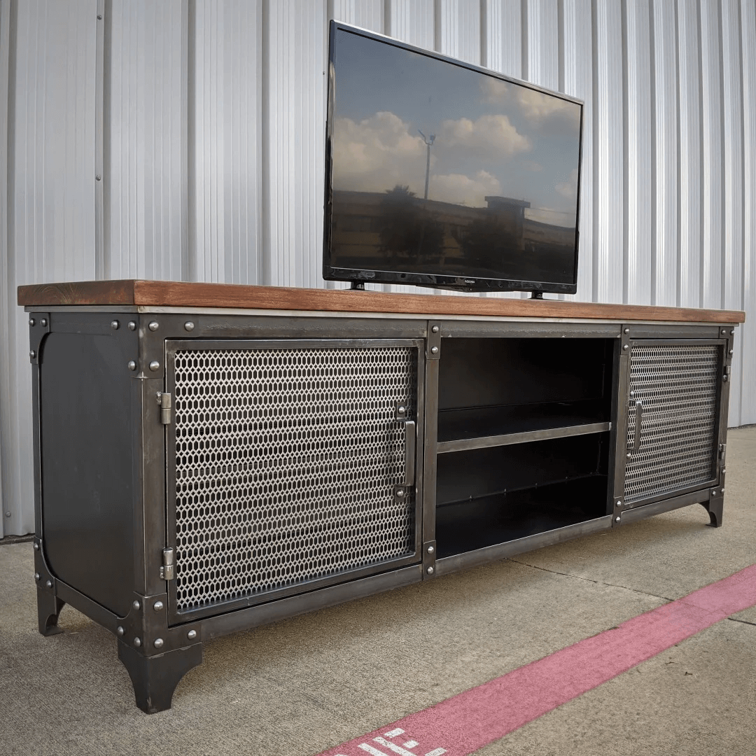TV ünitesi, masif ahşap ve endüstriyel çeliğin harika bir kombinasyonudur. Orijinal tasarımın küçük bir varyasyonu olan bu versiyon daha büyük kapılara sahiptir.